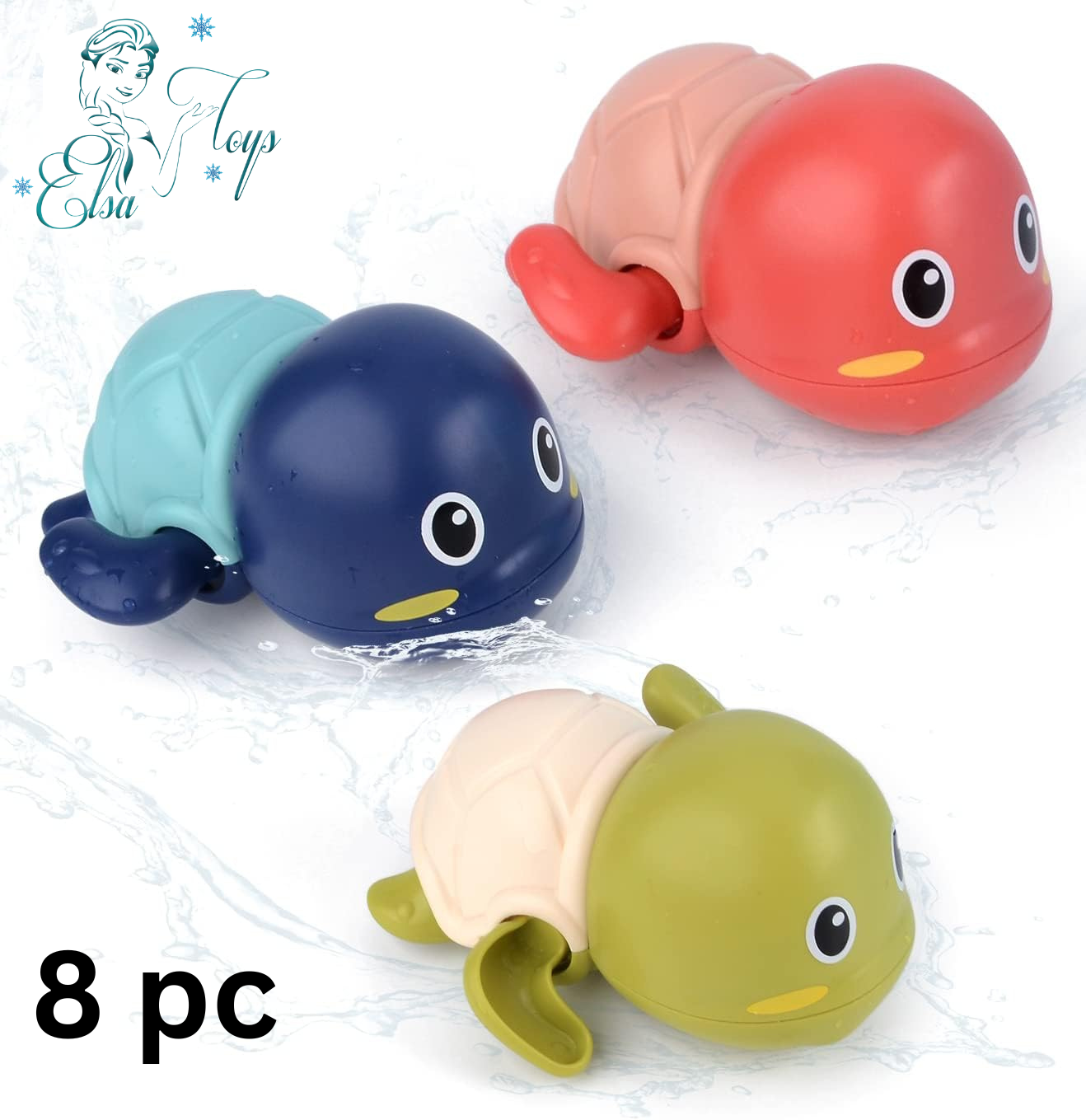 This product is a set of bath toys including three colored turtles three colored dolphins two ducks that work with the clock mechanism and swim in the water, making children interested in bathing and swimming. Its simple and safe plastic design with smooth edges and no battery required is ideal as a gift for one-year-olds.