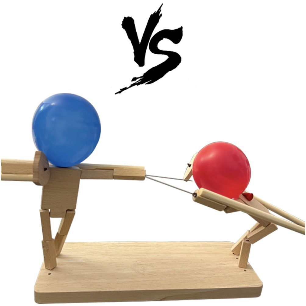 Innovative and fast wooden robot battle game for two players where you win by bursting the opponent's balloon.